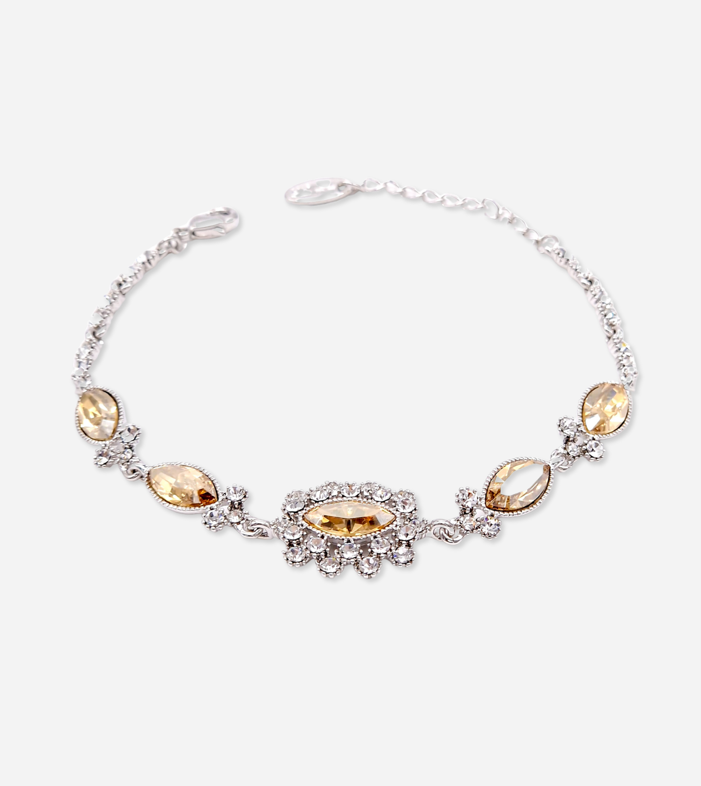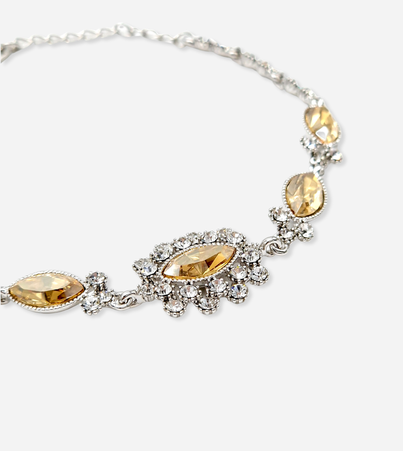 Bring sparkle and glamour to your outfit with this dazzling crystal bracelet. Large amber crystals are expertly set in surgical steel and bring a delicate hint of color to any ensemble, while smaller crystals add that extra special touch of sparkle. This is elegance and luxury without the price tag.