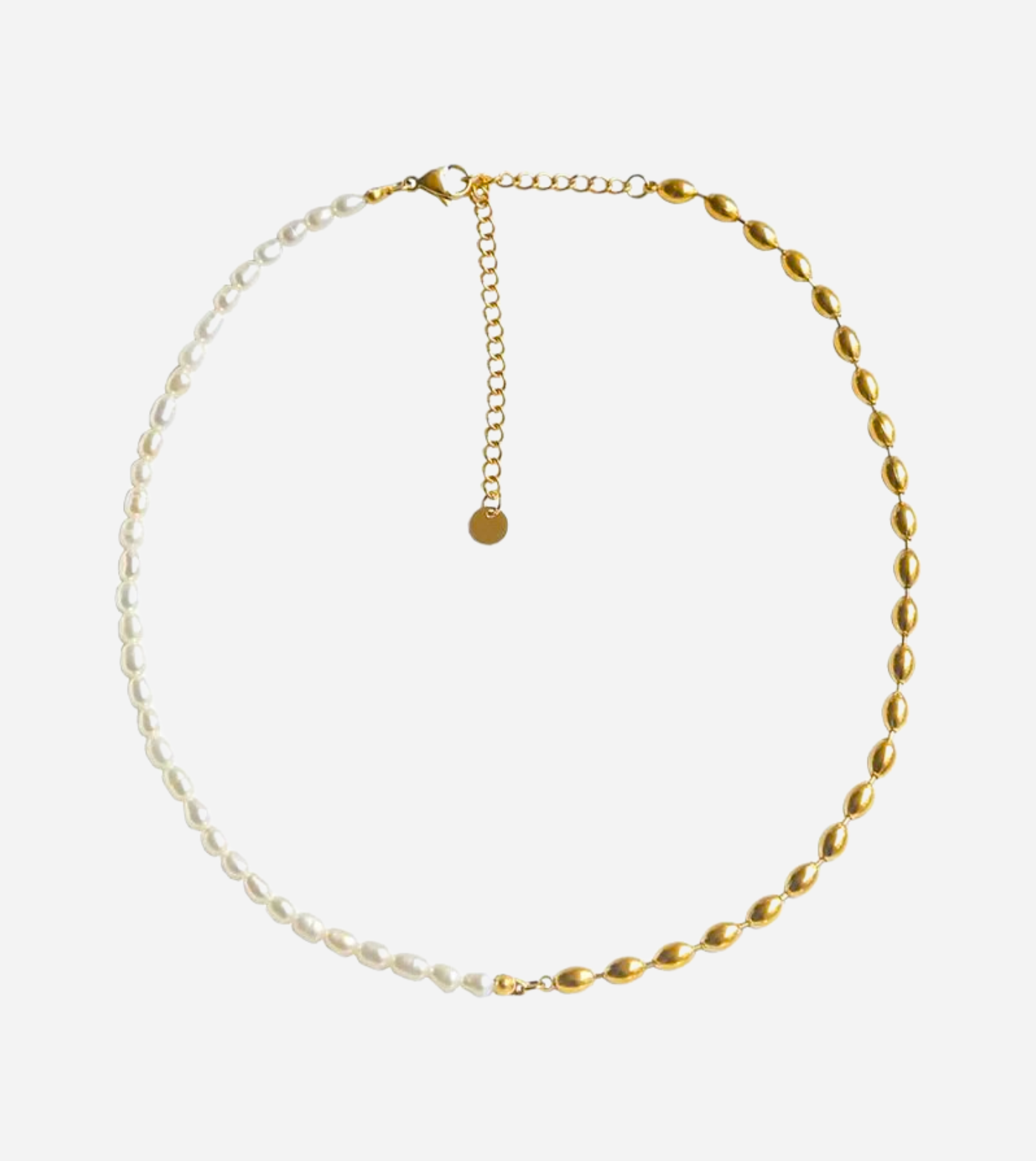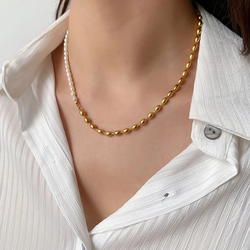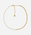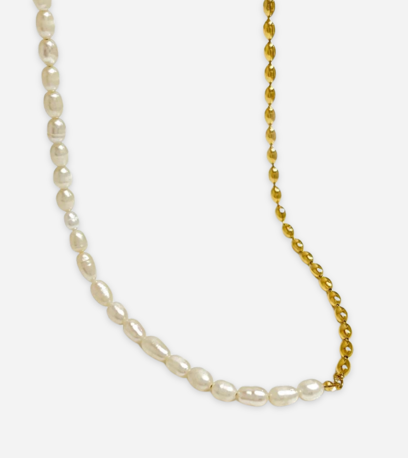 Discover the epitome of elegance with our freshwater pearl necklace featuring a bipartite design. Half adorned with lustrous freshwater pearls, and the other with gleaming gold beads, this necklace is a harmonious blend of sophistication and modern flair. Elevate your style with this unique accessory, offering a perfect balance of classic and contemporary allure.