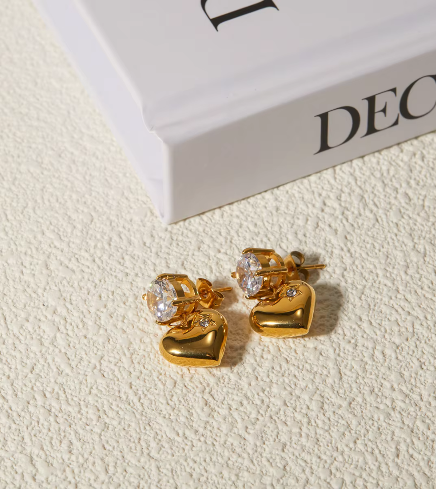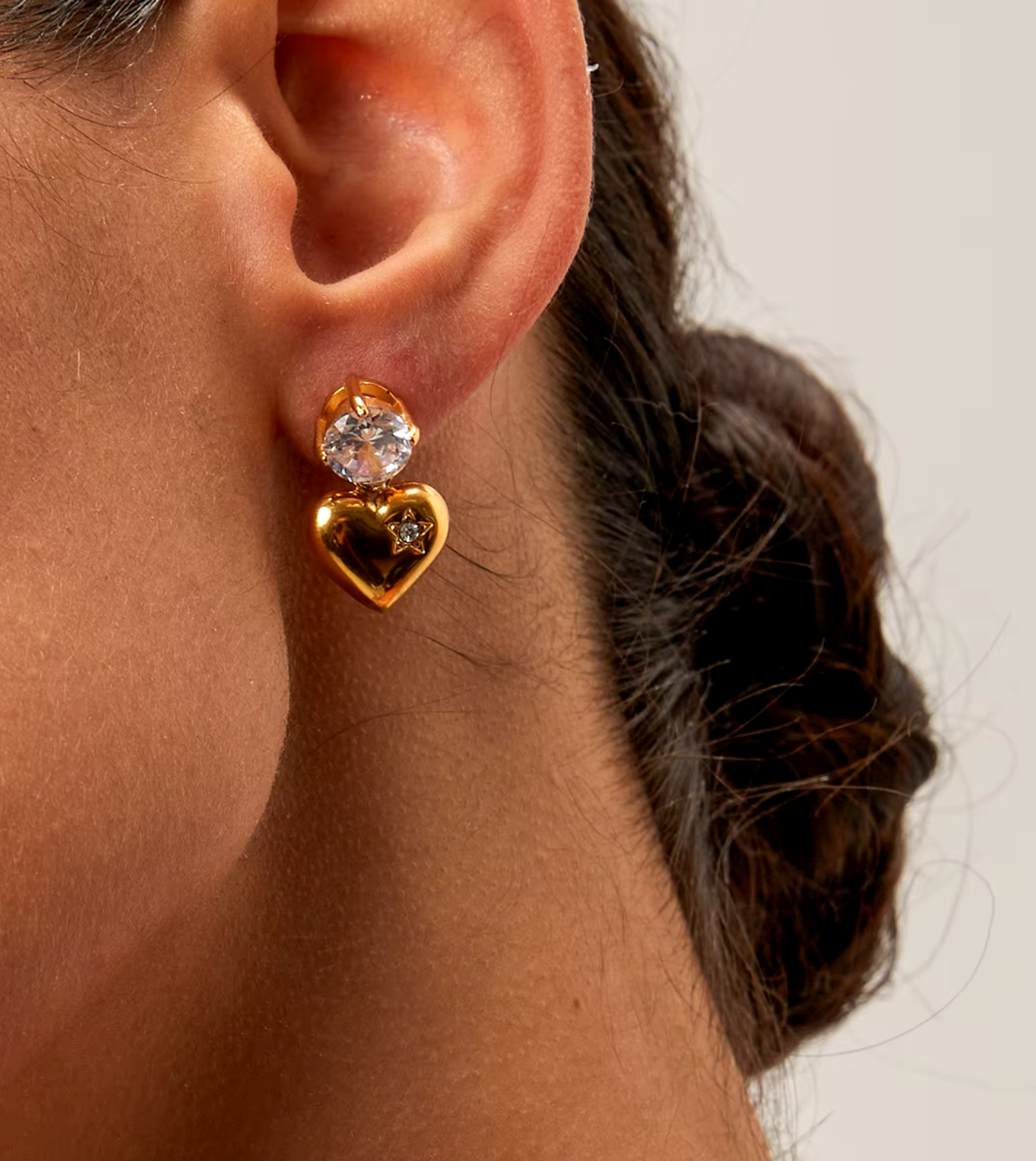 Add a touch of sparkle with our AAAA Cubic Zirconia Heart Dangle Earrings. These stunning studs feature a brilliant cubic zirconia stone, with a delicate heart charm that dangles gracefully below, adorned with a dainty, detailed star. Perfect for bringing a hint of romance and shine to any outfit.
