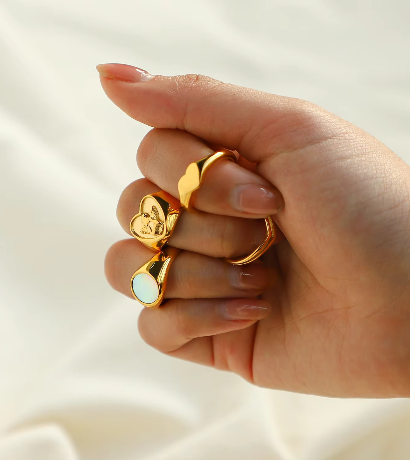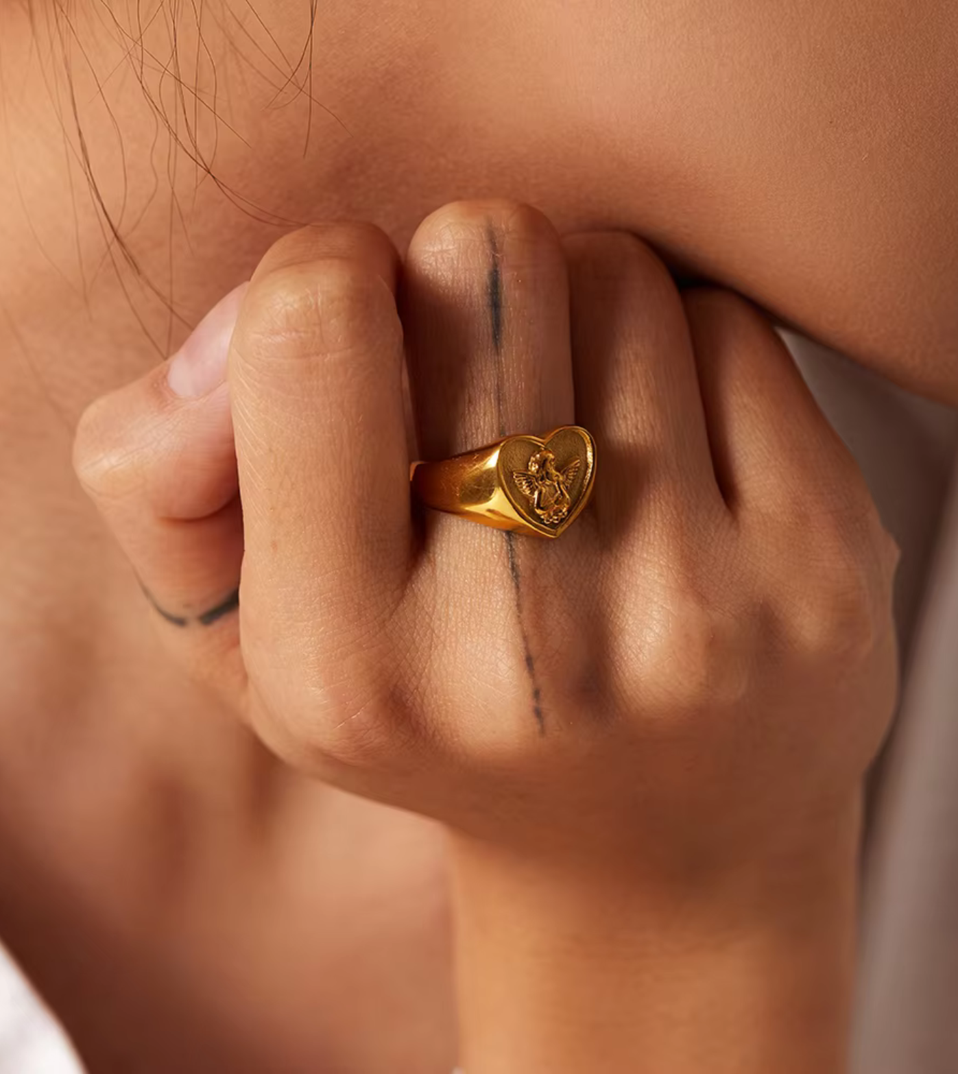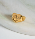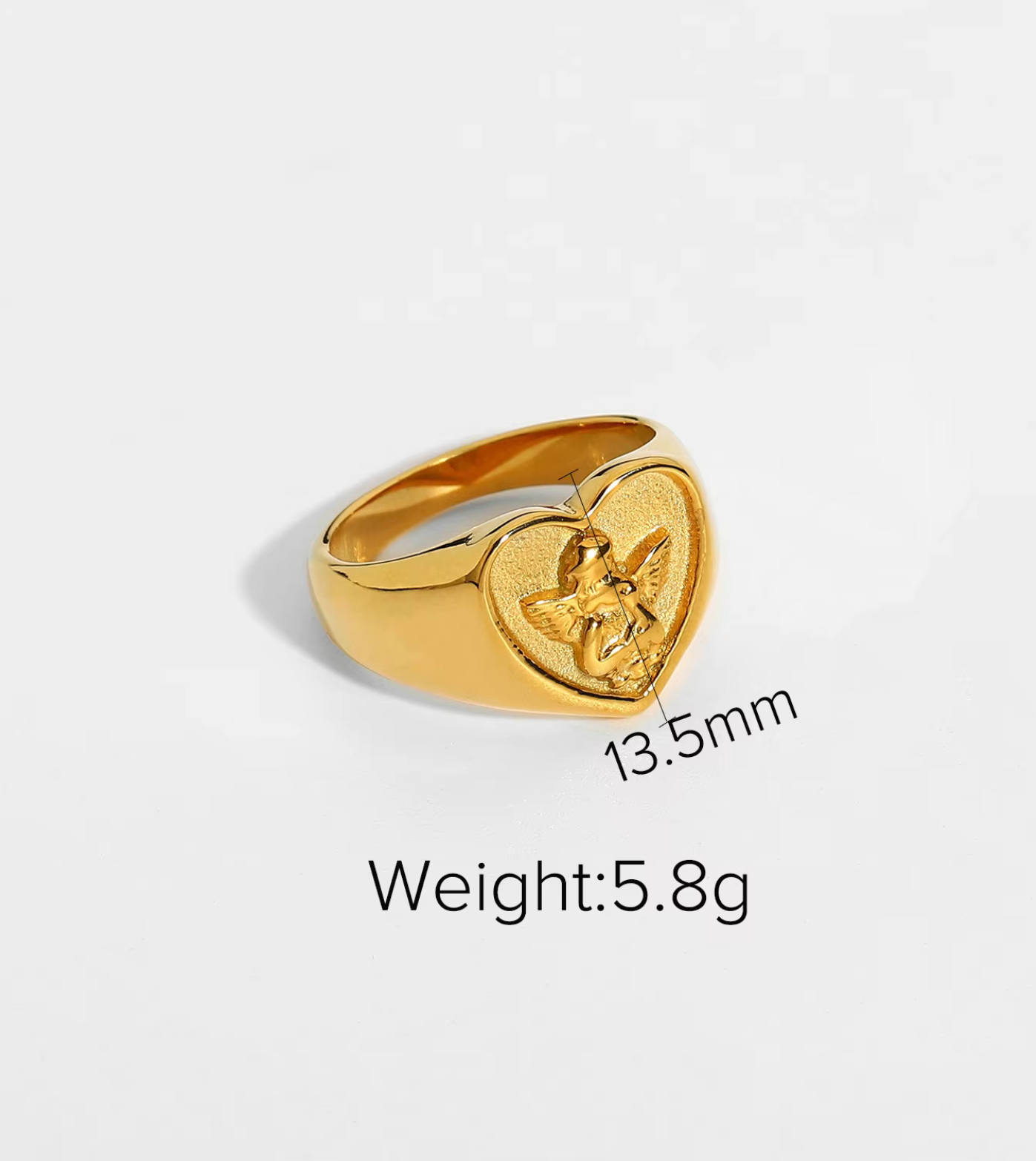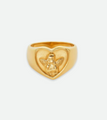 Our Cherub Heart Signet Ring is a beautiful blend of vintage charm and modern style. Featuring an intricately detailed cherub at the center of a heart-shaped signet, this dainty ring adds a touch of romance to any look. Perfect for stacking or wearing solo, it's a unique piece that speaks to the dreamer in you. Crafted with care, this is your new go-to ring for an effortlessly chic vibe.