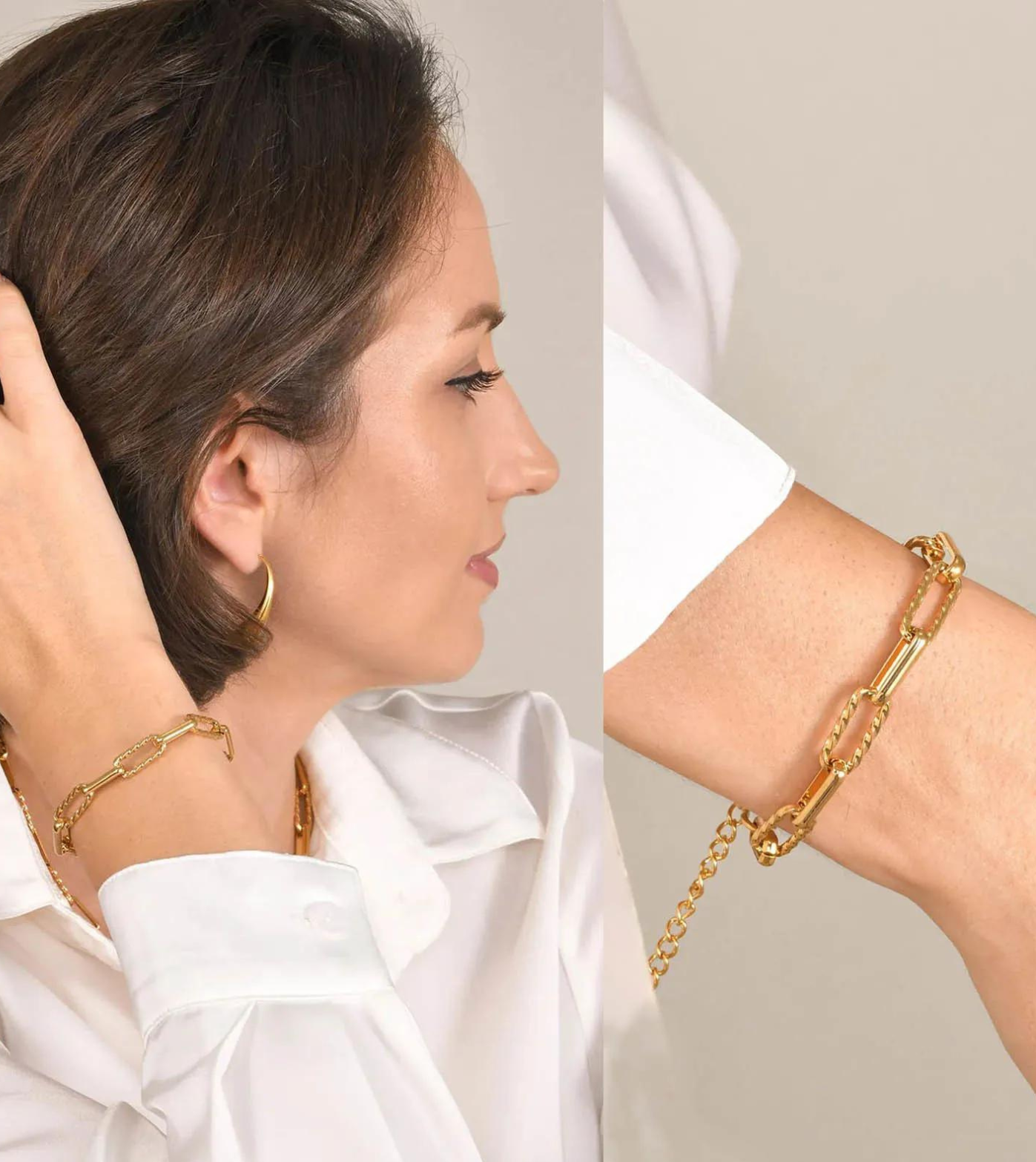 Wrap your wrist in bold elegance with our chunky oval link bracelet, featuring captivating twist details. This bracelet is a perfect fusion of modern flair on a classic chain bracelet, adding a touch of statement style to any ensemble.