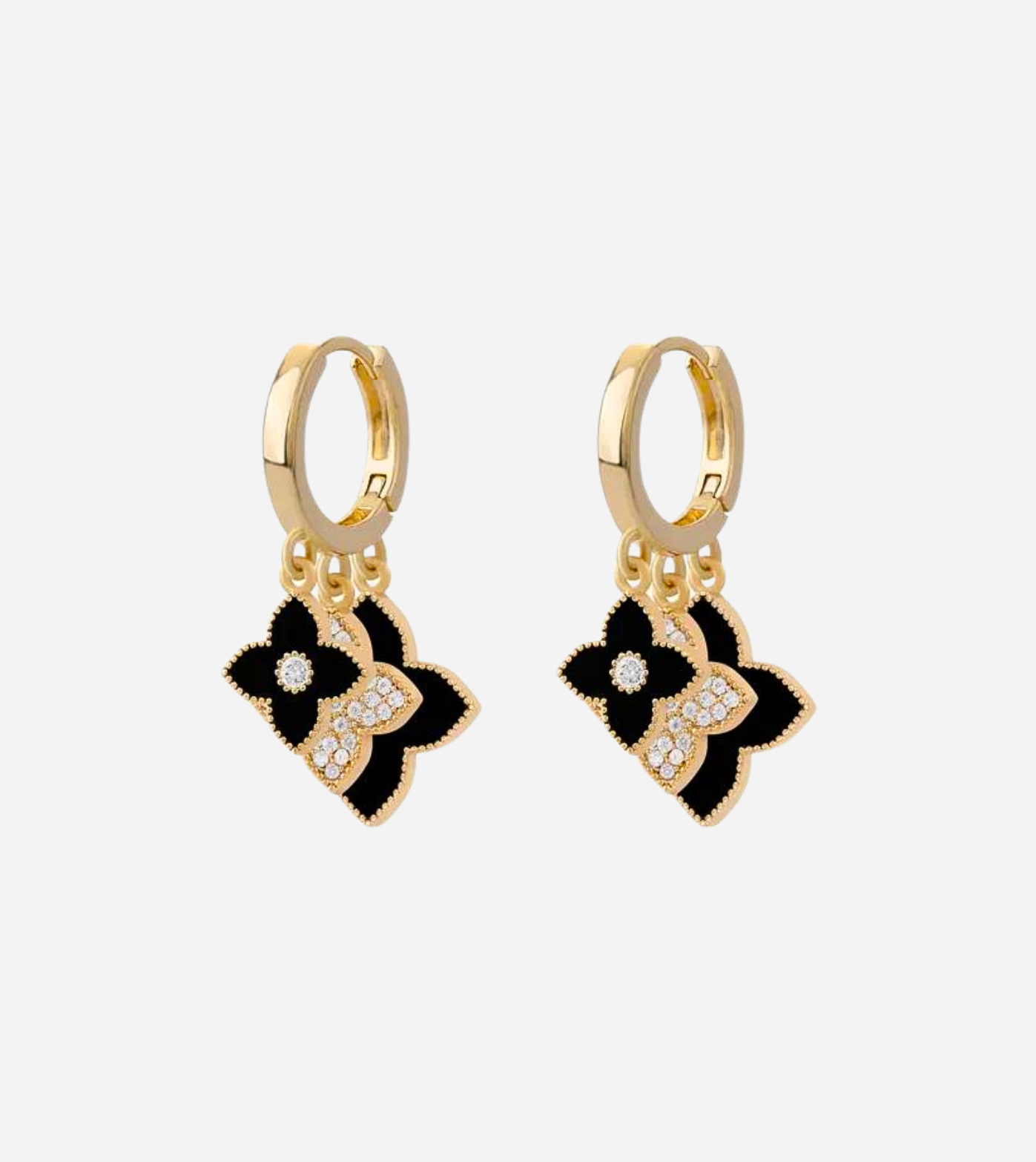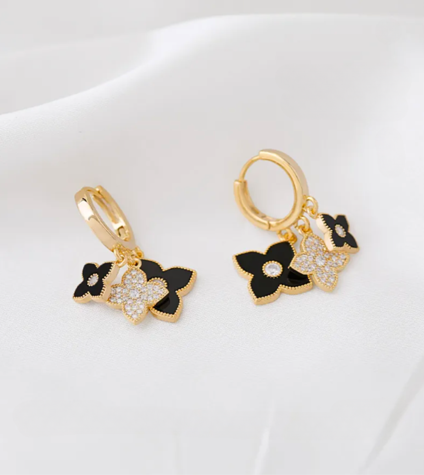 Step into luck and luxury with our dangle huggie earrings featuring three black clovers intricately studded with cubic zirconia. This enchanting design adds a touch of whimsy and sophistication to your ears, creating a unique and eye-catching accessory that blends intricate detailing with timeless charm