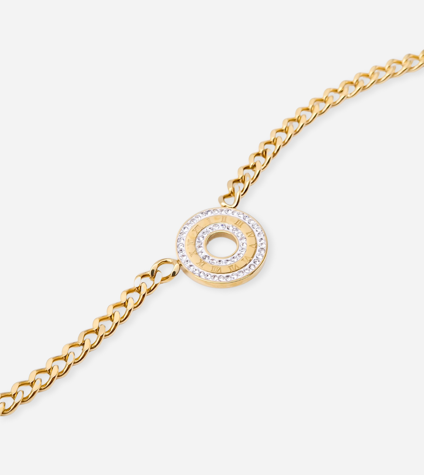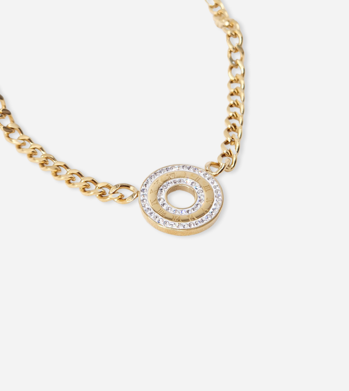 This stunning gold necklace is made from high-quality stainless steel and features a detailed pendant studded with sparkling crystals. The adjustable choker style measures 45 cm in length, making it the perfect fit for any neck size. The elegant and eye-catching design is sure to turn heads, while the use of crystals adds a touch of glamour.