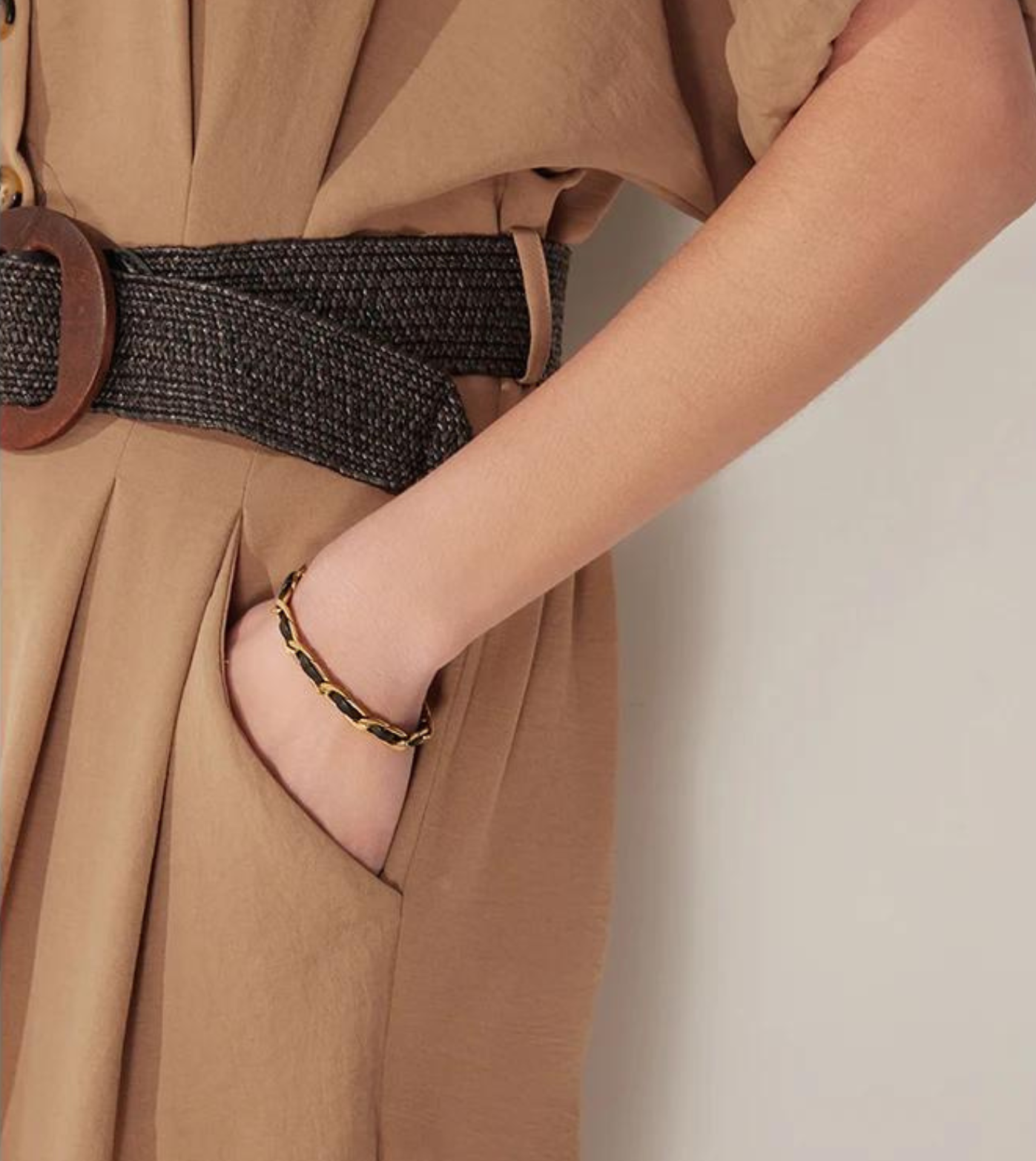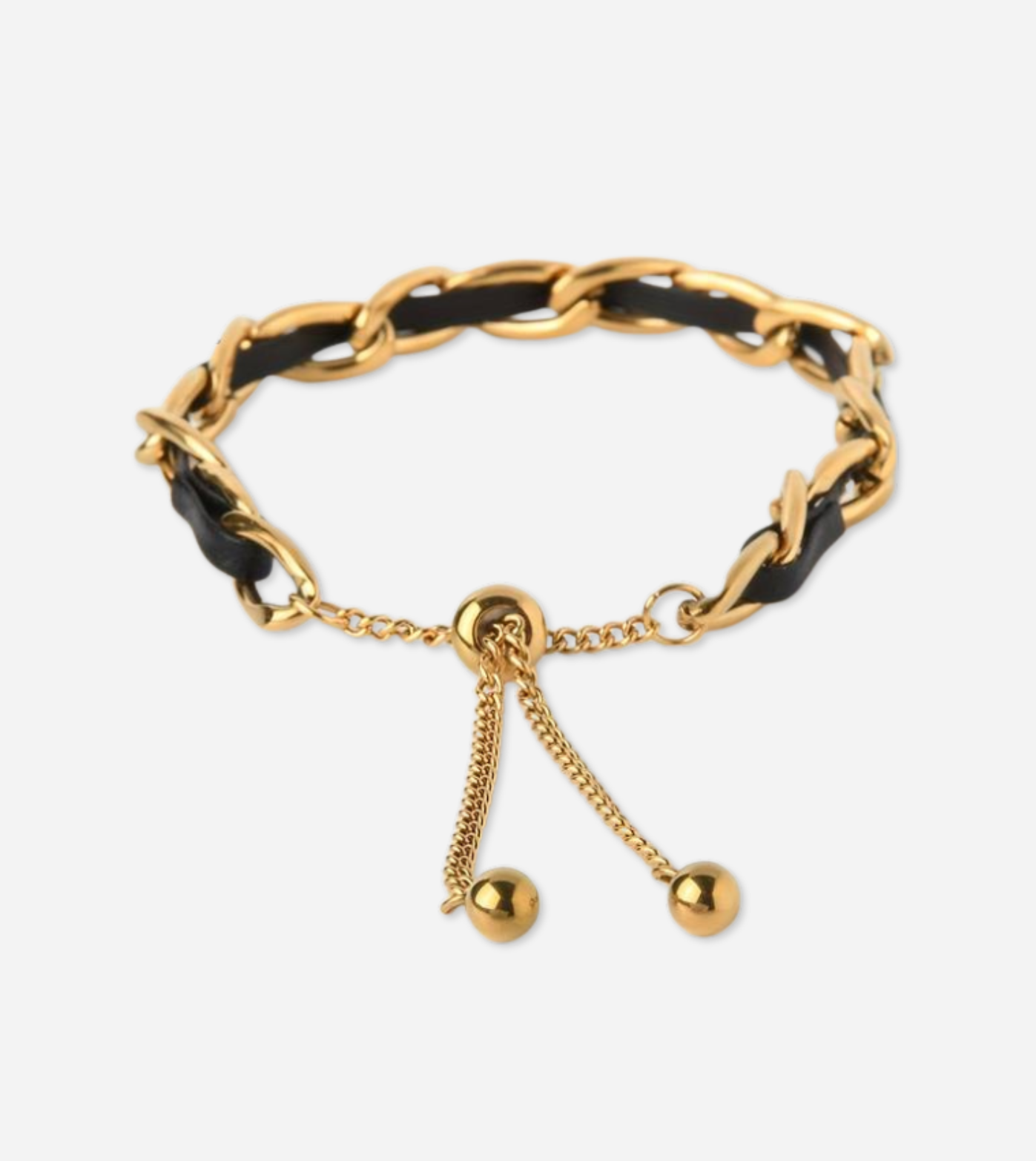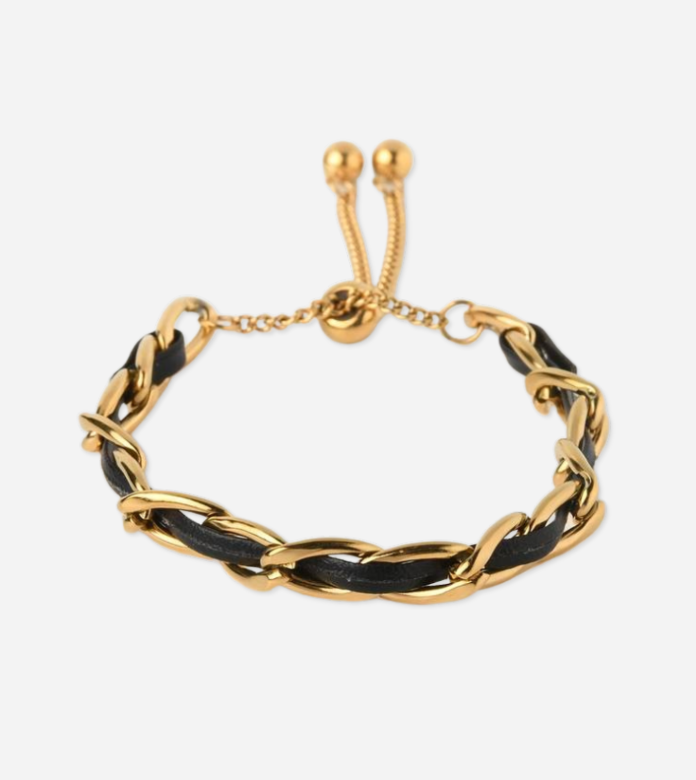 The bracelet features a chain intertwined with a black leather strap and an adjustable ring to fit any wrist size.