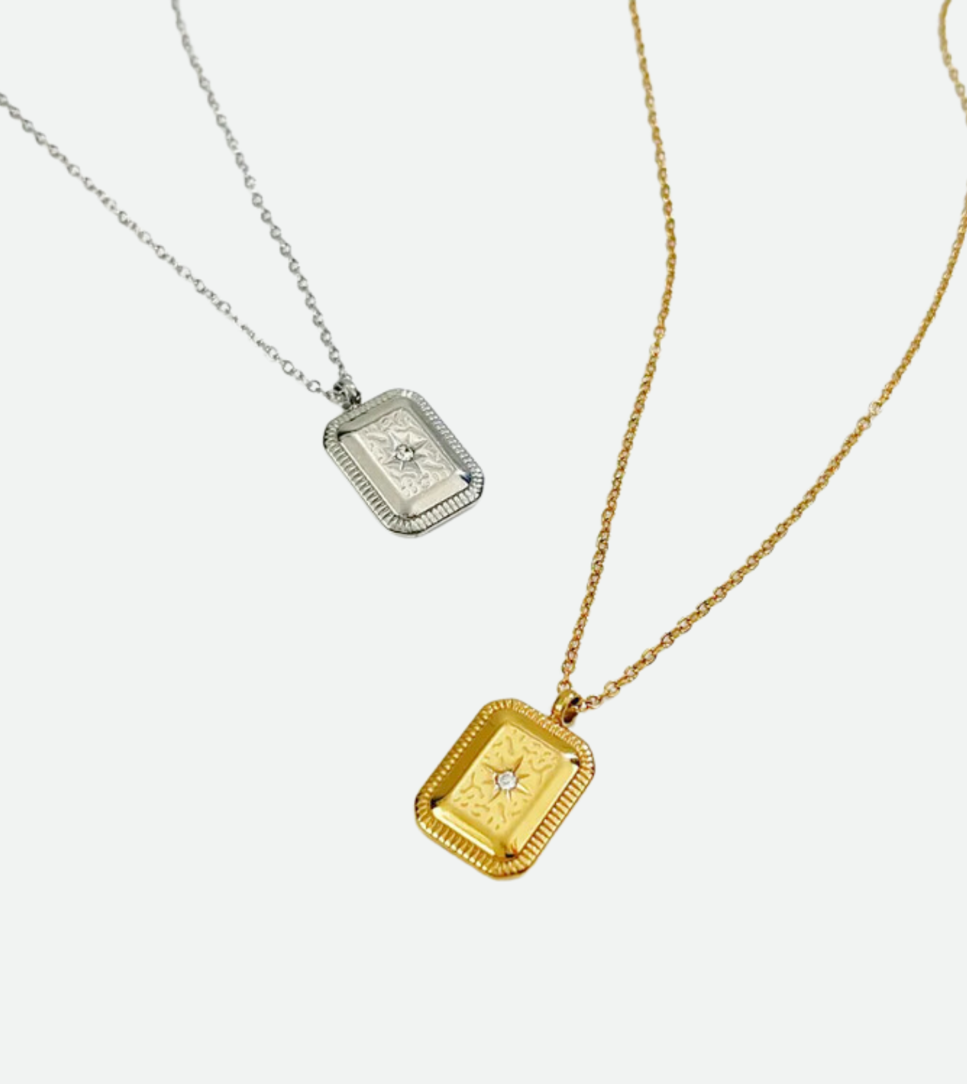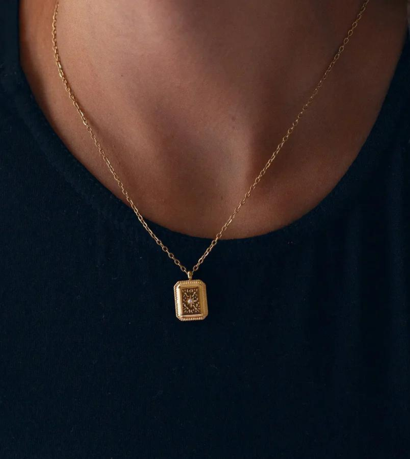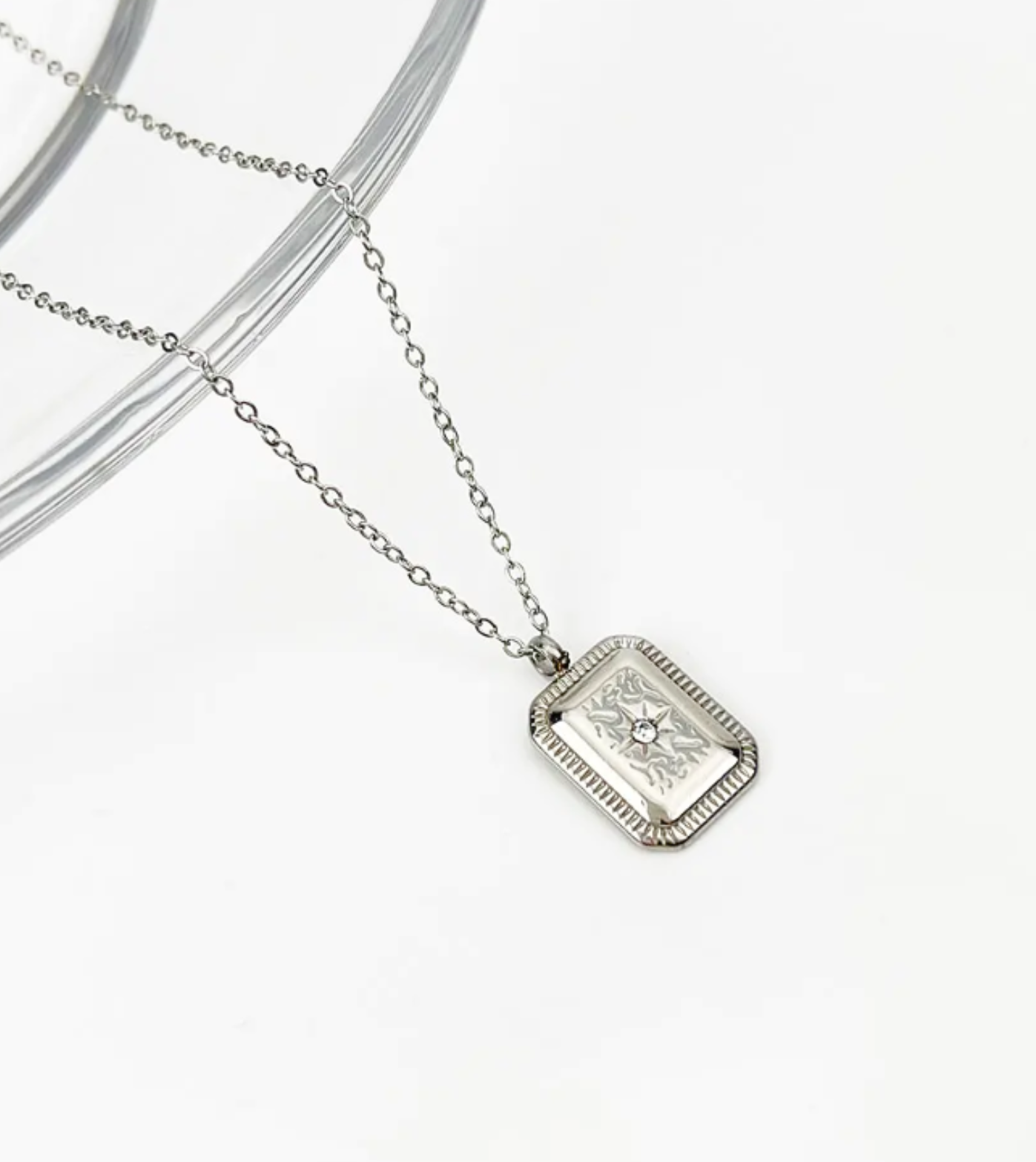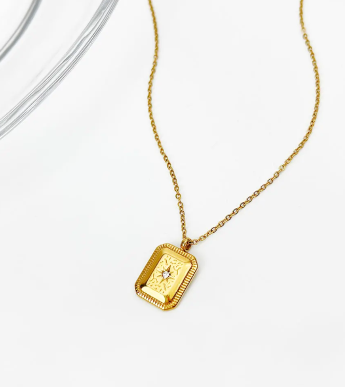 Add a touch of boho charm with this dainty necklace featuring a rectangular etched pendant adorned with a star and a sparkling cubic zirconia at the center.