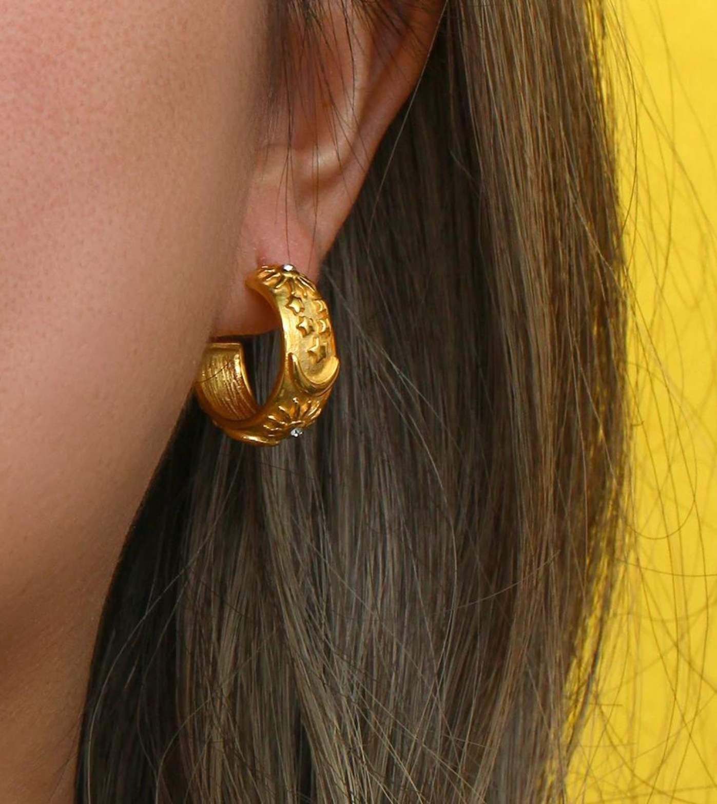 These stunning earrings perfectly complement our Celestial Detailing Boho Open Bangle and Ring. Adorned with sparkling cubic zirconia, these earrings capture the celestial magic of the night sky. Their open hoop design adds a touch of bohemian charm to any outfit, making them a versatile accessory for every occasion.