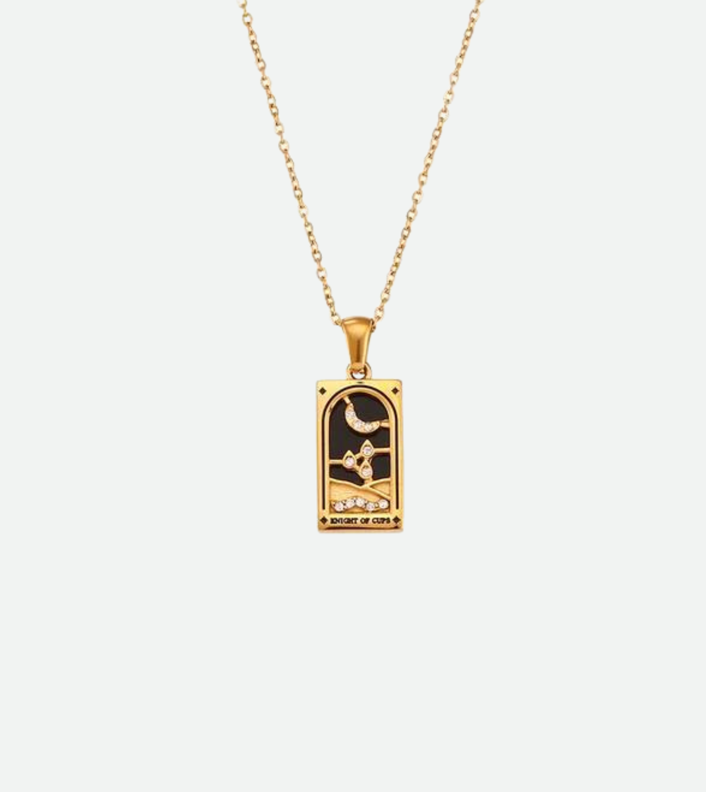 This exquisite piece showcases a detailed depiction of the knight of cups tarot card, a symbol of creativity and charm, set against a striking black background. Each detail is highlighted by dainty cubic zirconia stones, adding a touch of sparkle that contrasts beautifully with the deep backdrop. Perfect for tarot enthusiasts and lovers of unique, meaningful jewellery, this necklace invites intrigue and admiration wherever it's worn.
