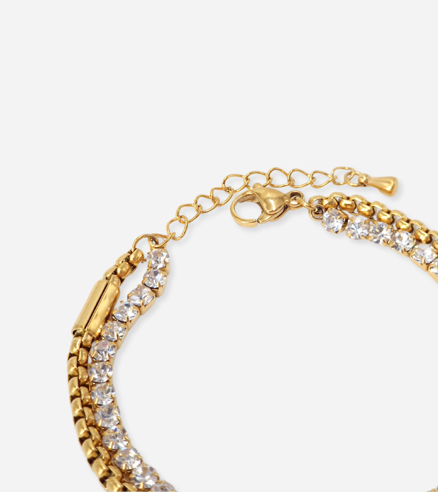 Add some glamour to your wrist with this chic layered bracelet. Two chains, featuring sparkling zircon crystals and trendy popcorn link chain, come together in this stunning design. The adjustable length ensures a perfect fit for any wrist size. Perfect for both casual and formal occasions, this bracelet is versatile enough to pair with any outfit.