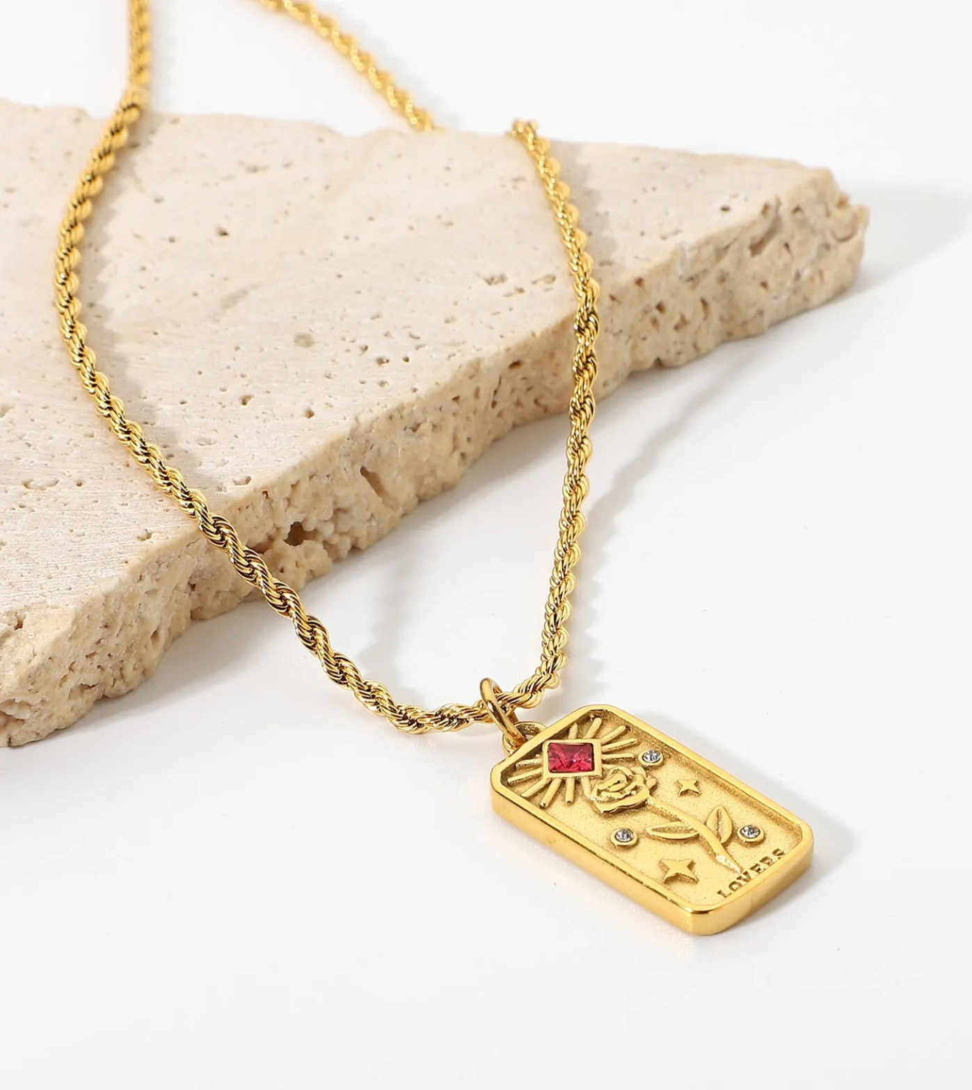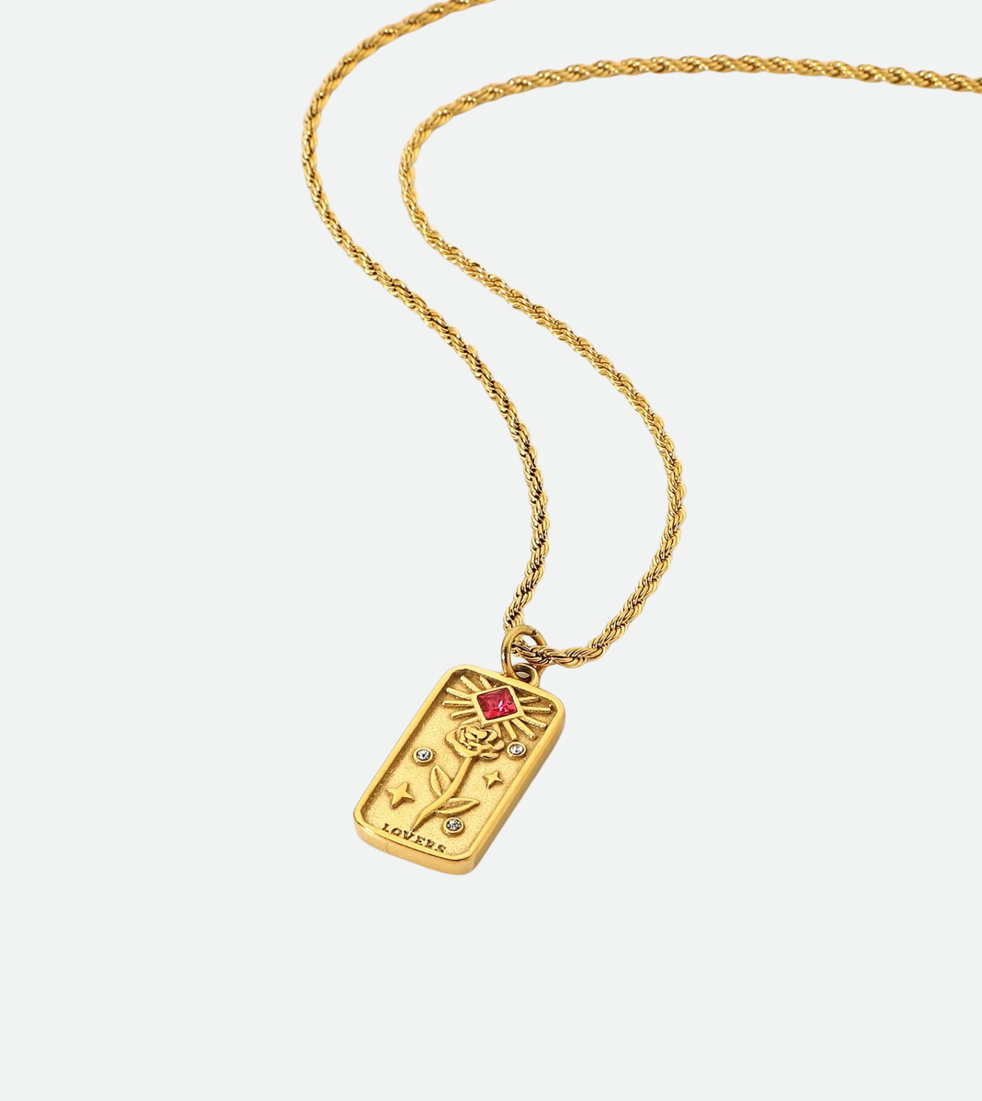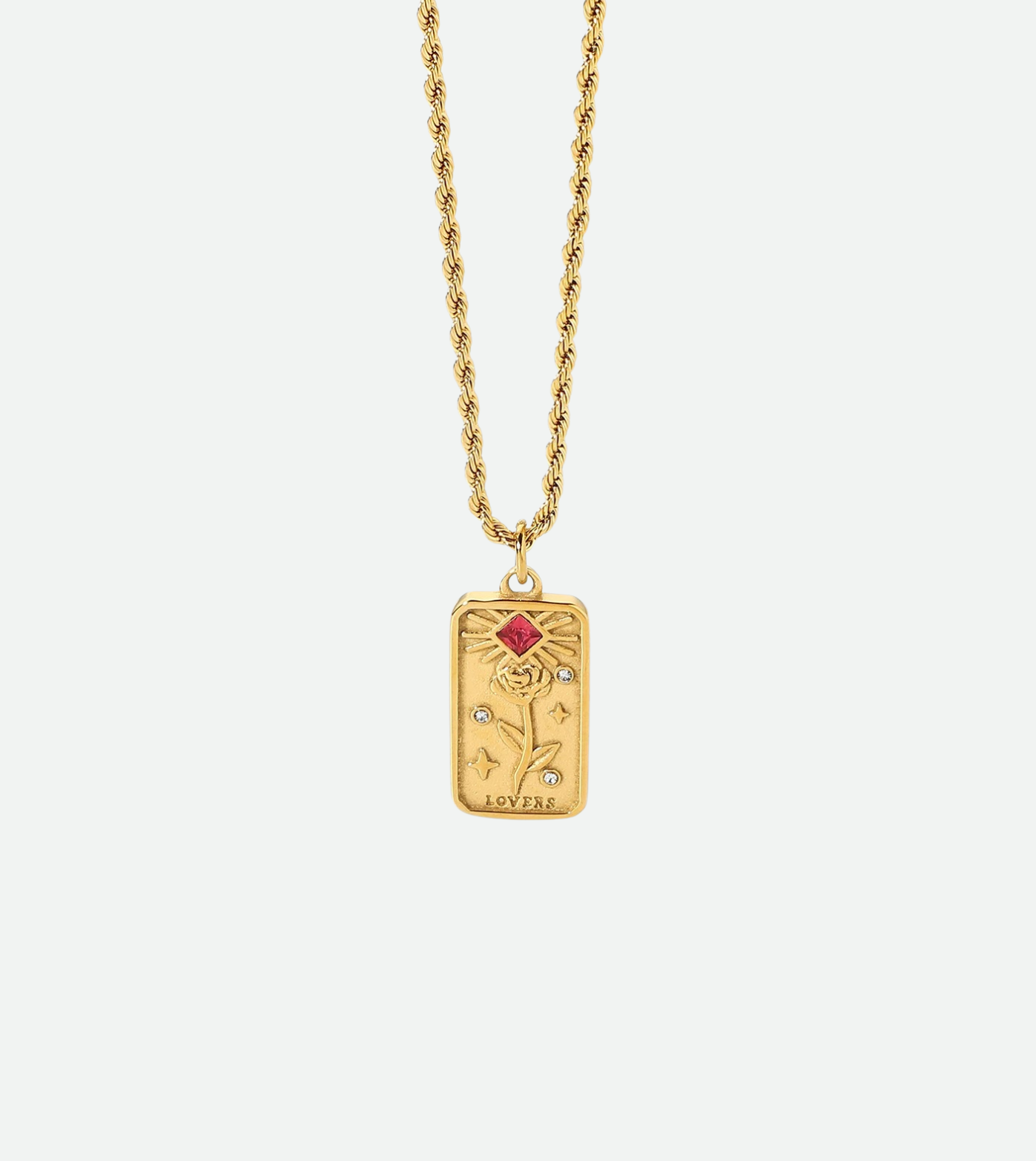 This exquisite piece captures the spirit of love and choice, featuring a beautifully detailed depiction of The Lovers card. At the heart of the design lies a vibrant pink cubic zirconia, symbolizing passion and affection, while a delicately etched rose enhances the theme of blossoming relationships. Crafted with attention to detail, this necklace is a charming ode to love's profound impact and an elegant addition to any jewelery collection.