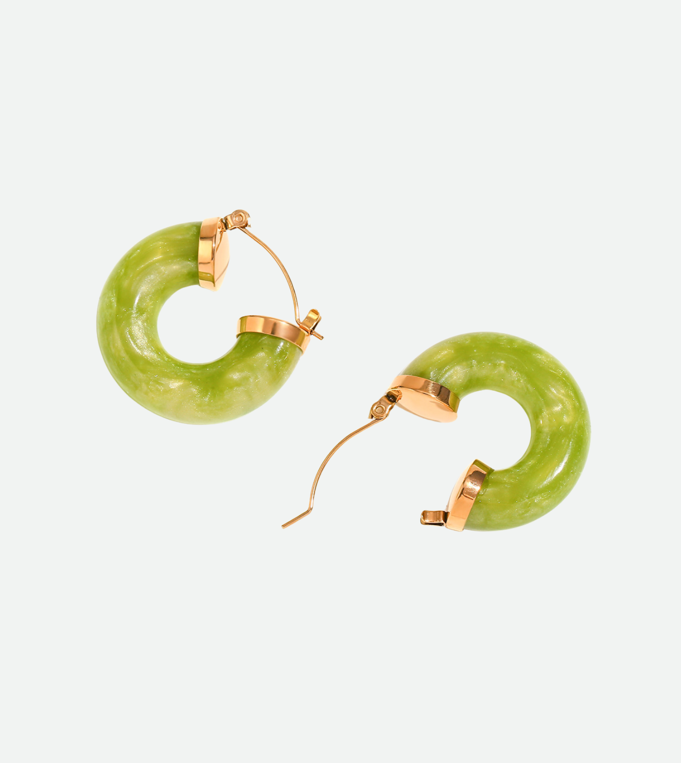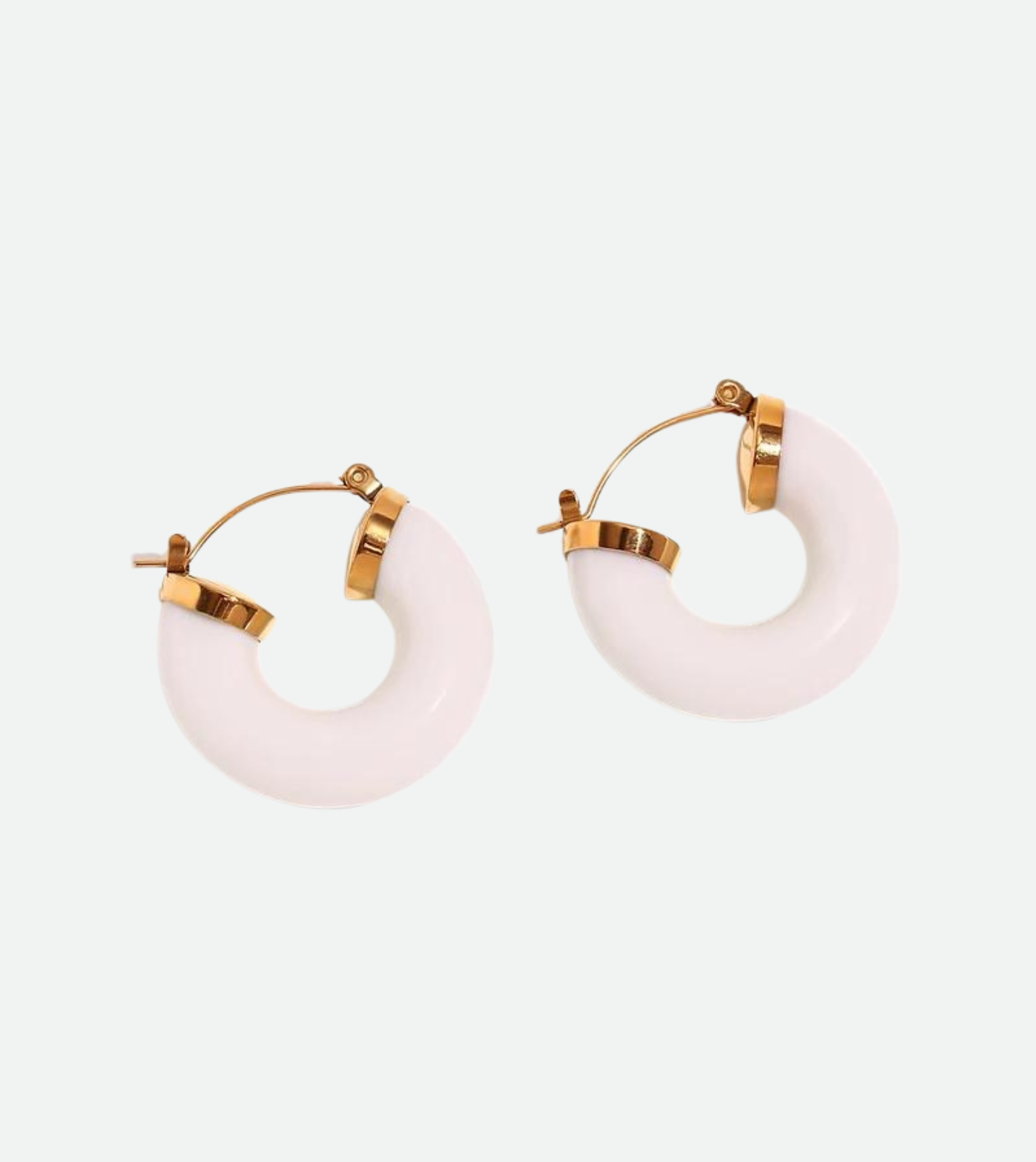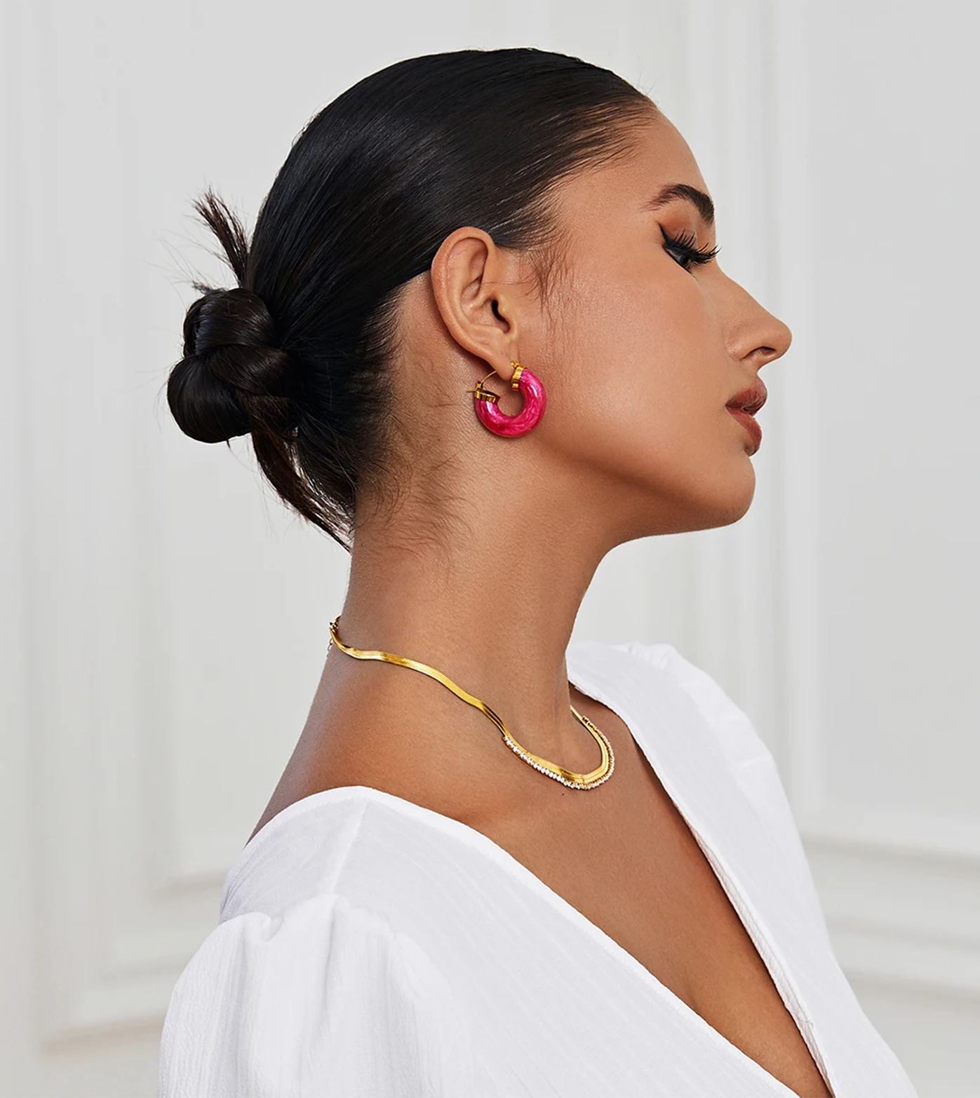 Elevate your summer look with our vibrant hoops! Available in an array of eye-catching colors including crisp white, playful pink, serene jade, and lush green, these hoops are sure to add a pop of fun to any outfit. Crafted with a hinged clasp and plated in luxurious 18k gold, they offer both style and comfort. Whether you're lounging by the pool or hitting the beach, these hoops are the perfect accessory to showcase your summer style.