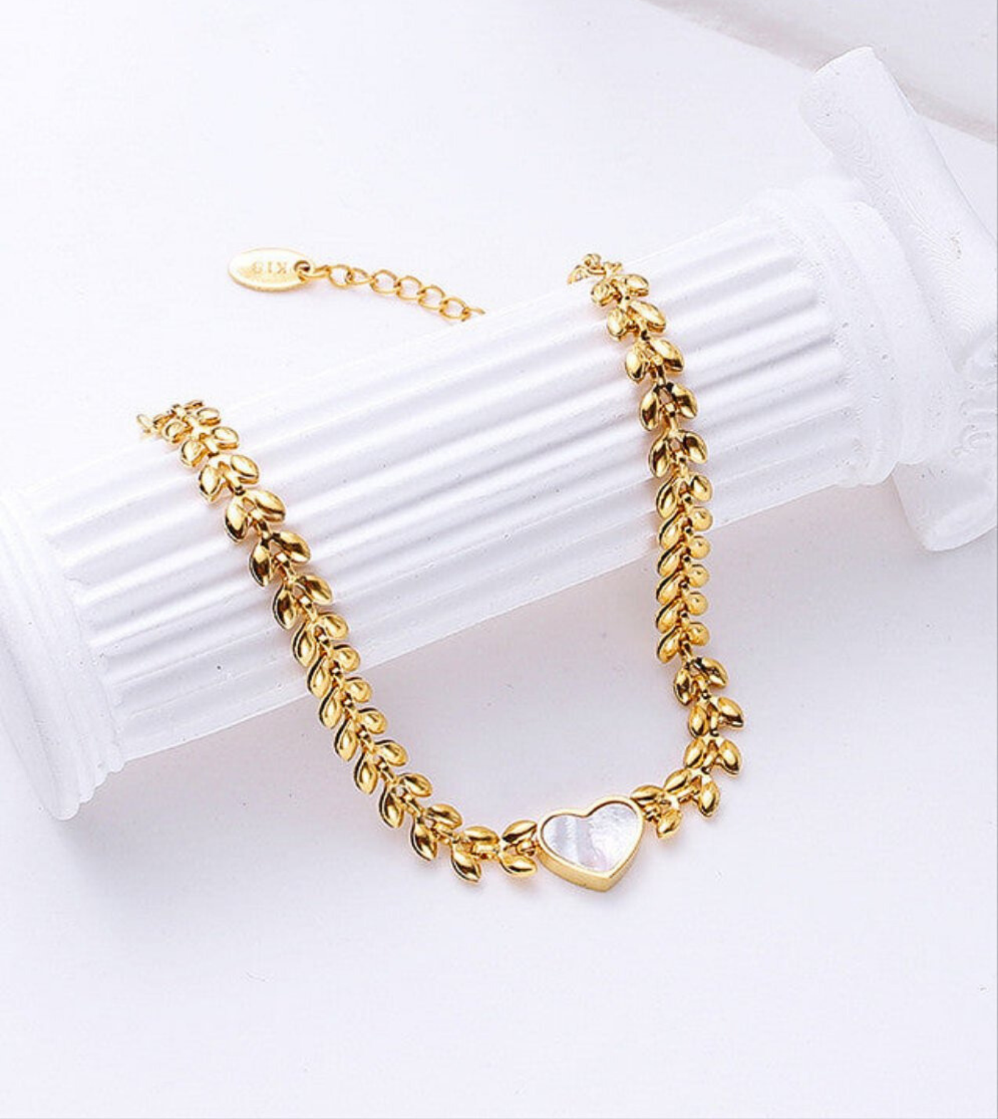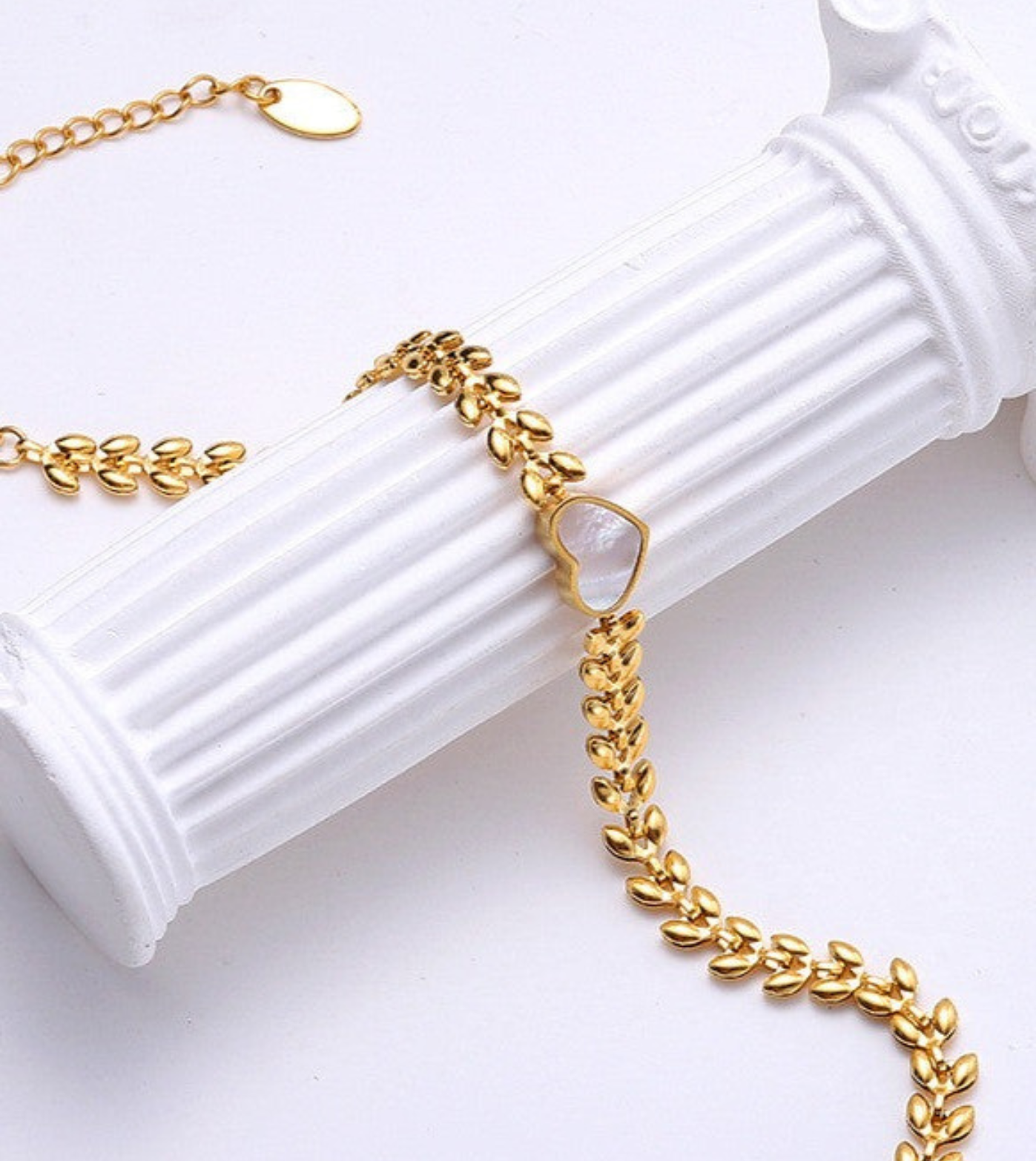 This bracelet features a nacre white heart and an intricately crafted decorative chain, The adjustable design ensures a comfortable fit for all wrist sizes. Don't miss out on the chance to add this versatile and stylish piece to your accessory collection. Order now and elevate your fashion game with this beautiful bracelet.