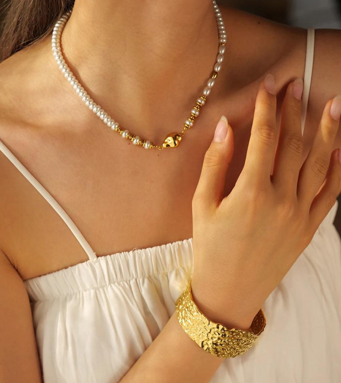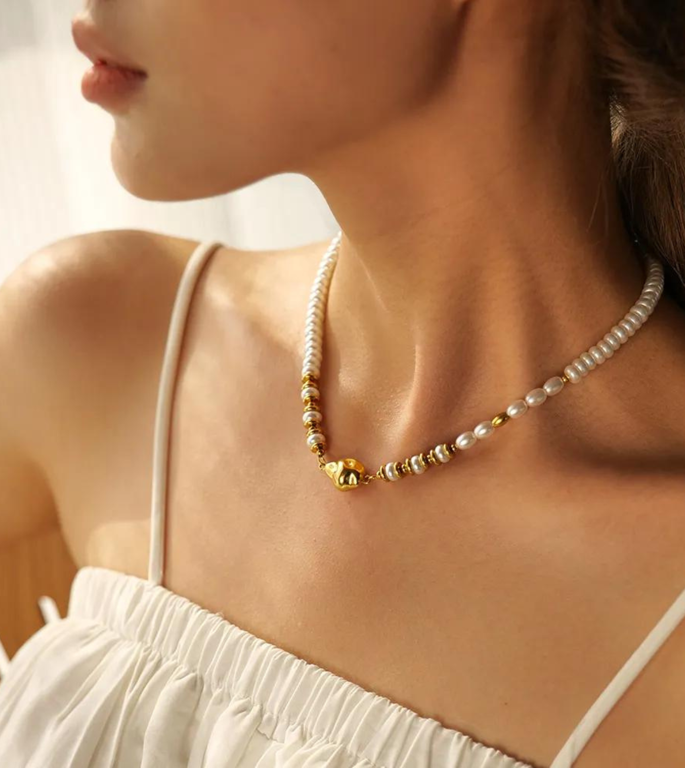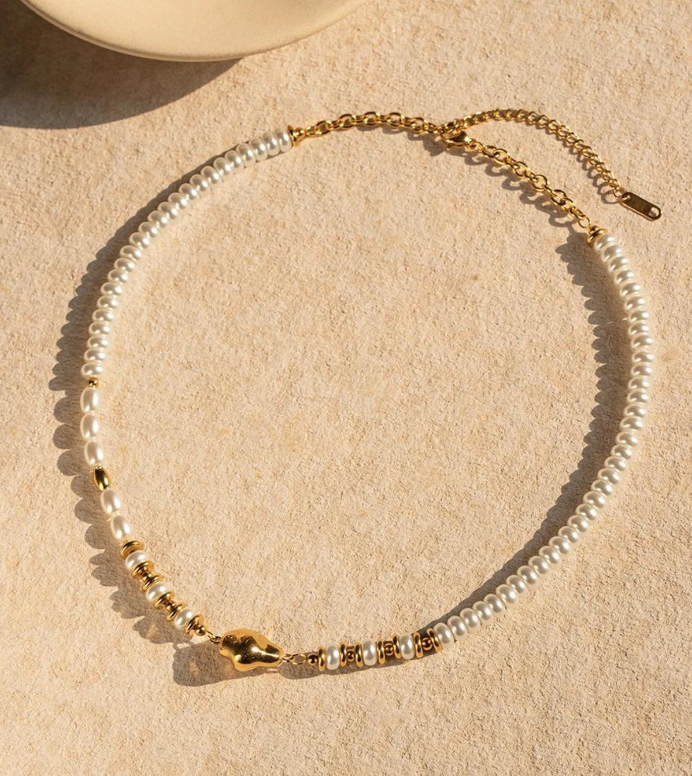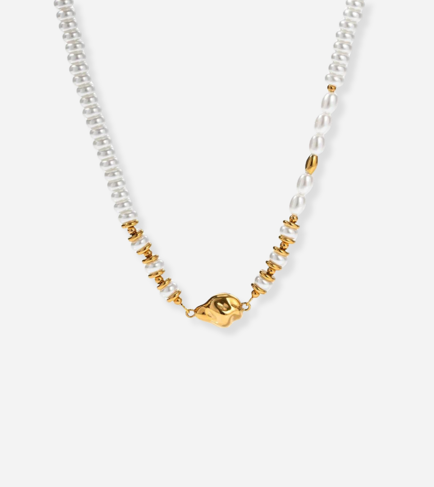 Drape yourself in timeless elegance with our simulation pearl bead necklace adorned with intricate 18k gold details and a striking gold nugget pendant. This piece seamlessly blends sophistication with a touch of opulence, creating a necklace that's both classic and contemporary. Elevate your style with the luxurious allure of pearly sheen and gold.