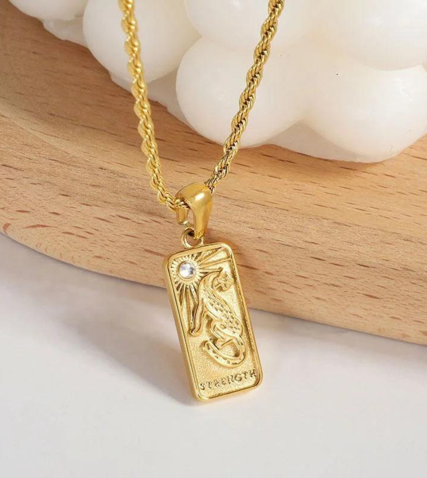 Unleash your inner strength with our captivating 'Strength' Tarot Card Pendant Necklace. Crafted with meticulous attention to detail, this necklace features the iconic image of a majestic leopard, symbolizing courage, resilience, and inner power. Wear this necklace as a daily reminder of your inherent strength and ability to overcome any challenge with grace and determination.