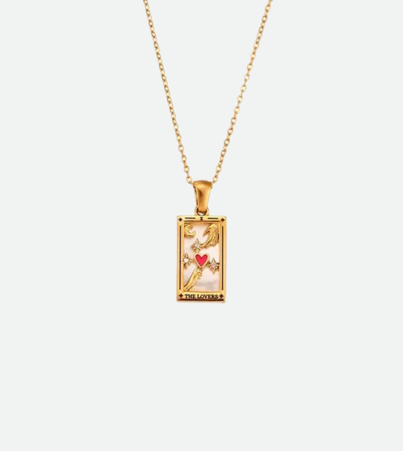 Unveil the magic of connection with our 'The Lovers' tarot card pendant necklace. This captivating piece features a beautifully detailed representation of the iconic Lovers tarot card. Set against a luminous nacre background, the intricate design is accentuated with sparkling cubic zirconia stones, adding a celestial shimmer. This necklace not only serves as a stunning accessory but also as a meaningful symbol of love and harmony, making it a perfect gift for someone special or a cherished addition to your own collection.