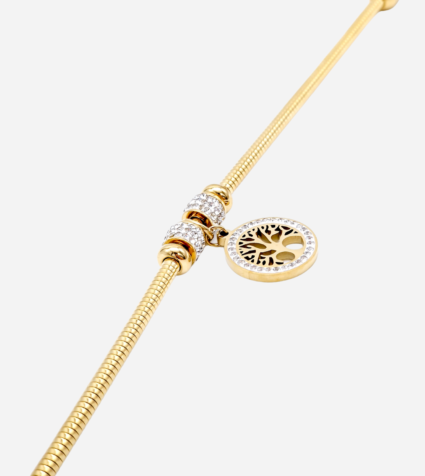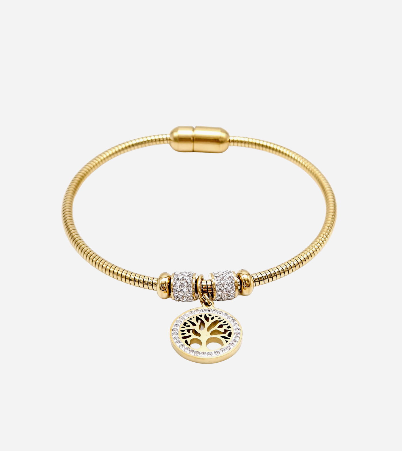 This gold snake chain bracelet is adorned with a lucky tree charm and crystals that add a touch of sparkle and elegance. The snake chain design gives it a unique and trendy look. This elegant and sparkling bracelet is perfect for any occasion, whether it be dressed up or dressed down. It's easy to wear and features a magnetic clasp.