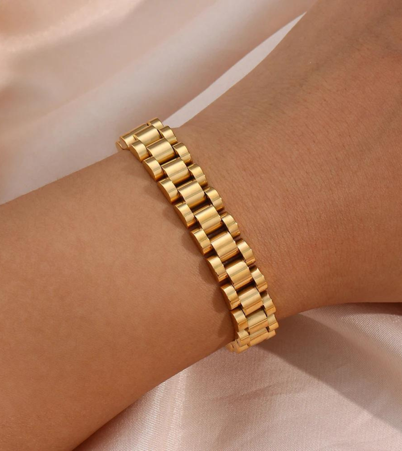 sleek and stylish 18k gold watch strap bracelet! It's the perfect blend of luxury and versatility. Elevate your wrist game effortlessly. Perfect for stacking with other pieces or worn on its own as a statement piece.