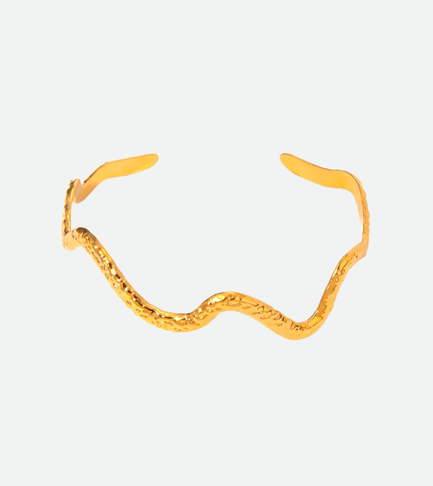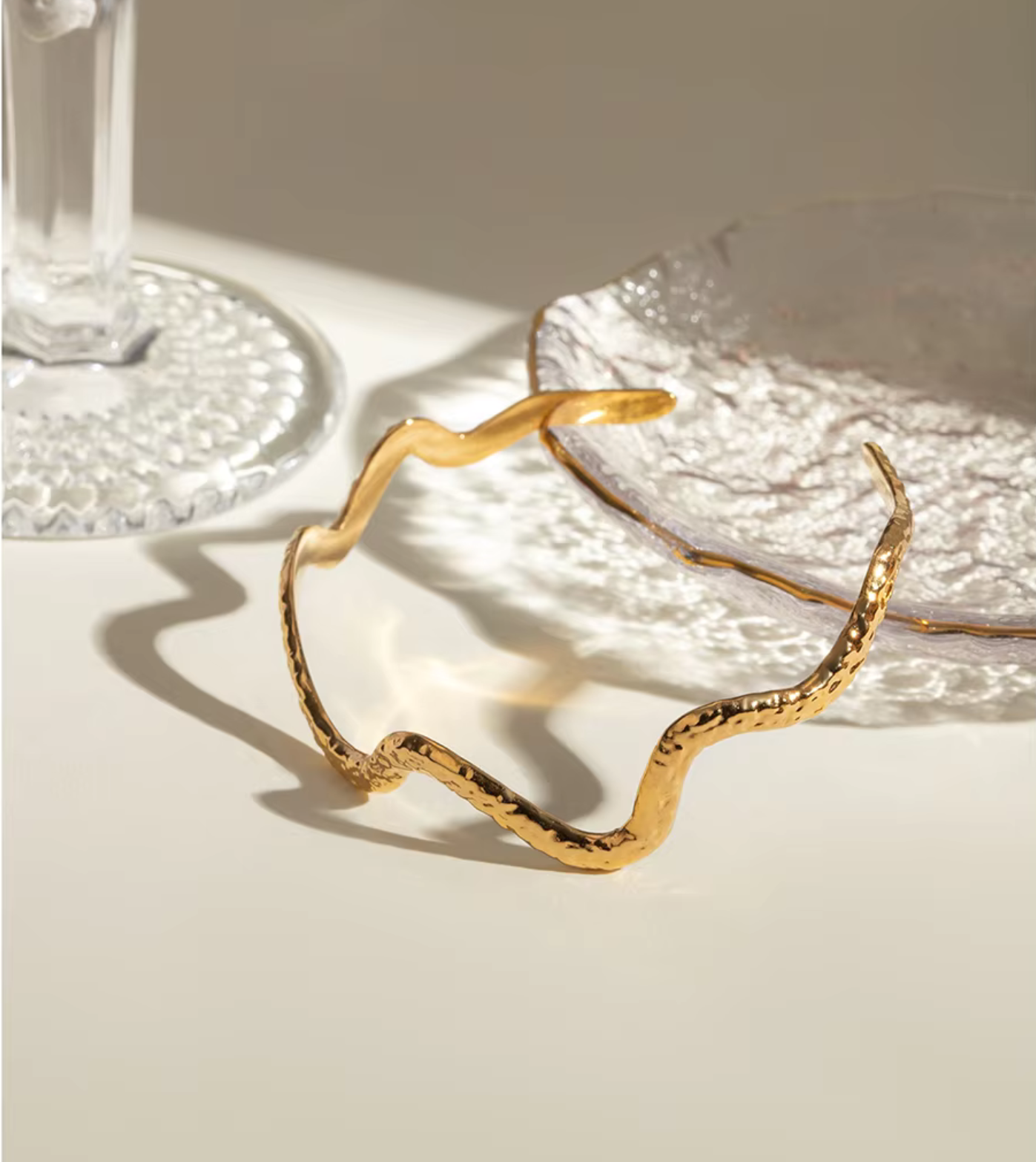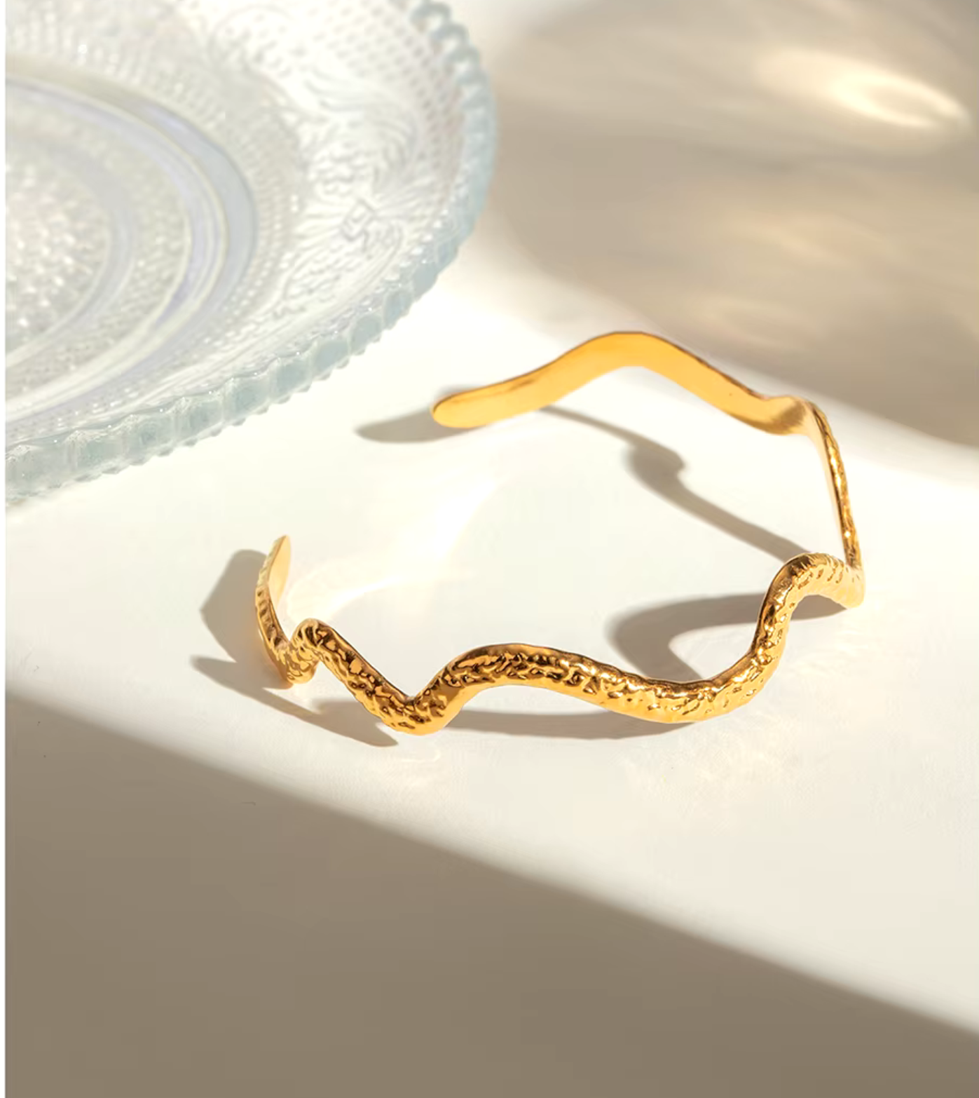 Channel effortless boho style with our Wavy Bangle. Crafted from durable titanium and plated in 18k gold PVD, this adjustable bangle features a unique wavy design that adds a subtle yet eye-catching touch to any outfit. Perfect for stacking or wearing solo, it’s an essential for any jewelry lover.
